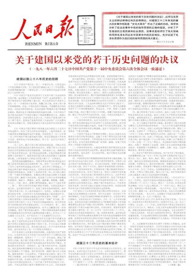 1981年6月27日,党的十一届六中全会正式召开,《历史决议》草案在会上获得一致通过。6月29日,邓小平在大会闭幕式上讲话说:“相信这个决议能够经得住历史考验。”